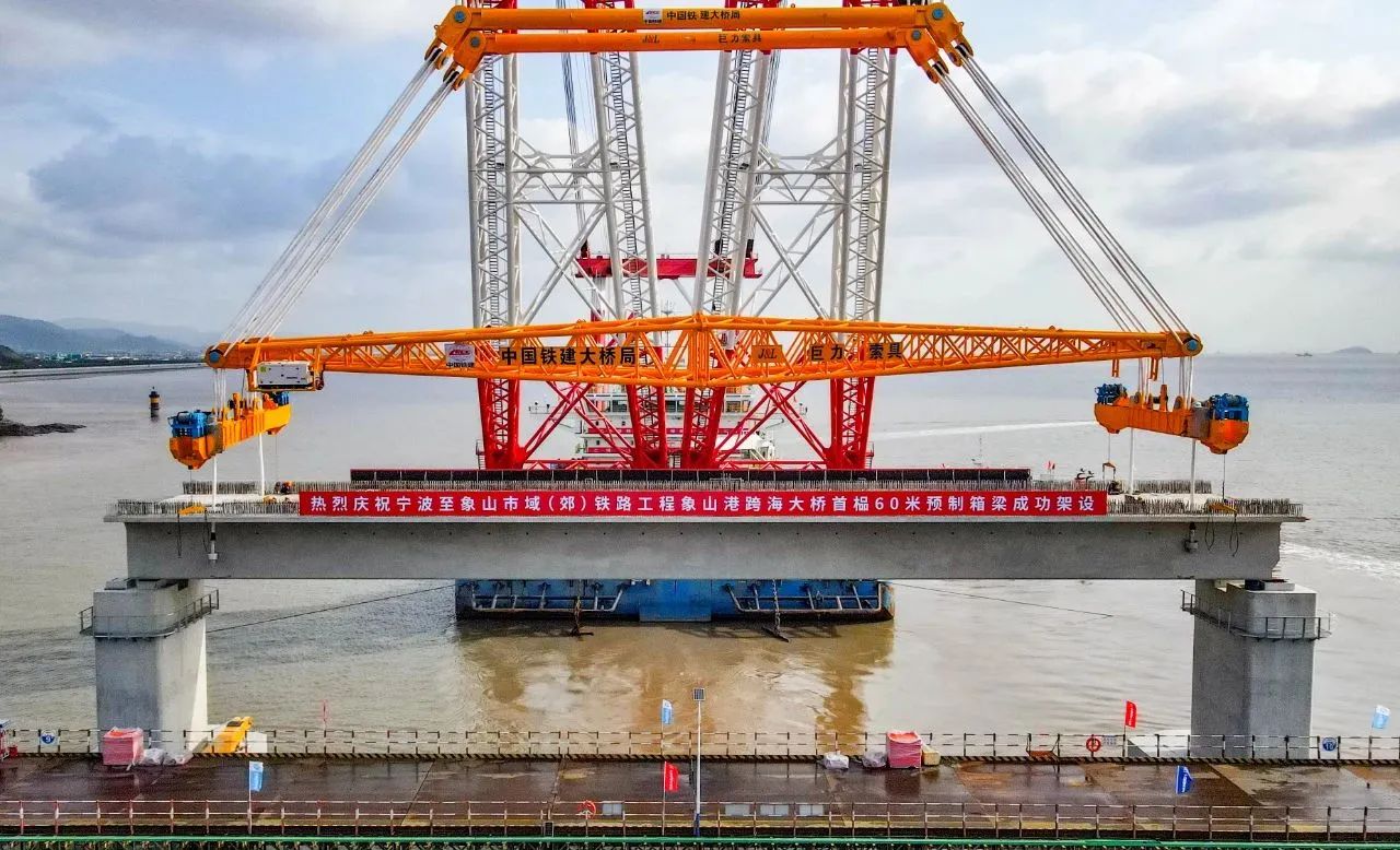 大橋海上架設預制箱梁共66榀,每榀梁長60米,寬10.6米,重約1700噸,吊具重280噸,總體起吊總重1980噸,是國內市域(郊)鐵路工程跨度最大、噸位最重的預應力混凝土預制箱梁。